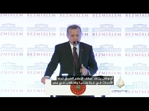 كما انتقد أردوغان -في افتتاح العام الدراسي الجديد في إحدى الجامعات التركية بإسطنبول- ما وصفه بازدواجية الإعلام الغربي تجاه أحداث في تركيا ومصر وغزة، مقارنة بالتعاطي مع ما يحدث في عين العرب.